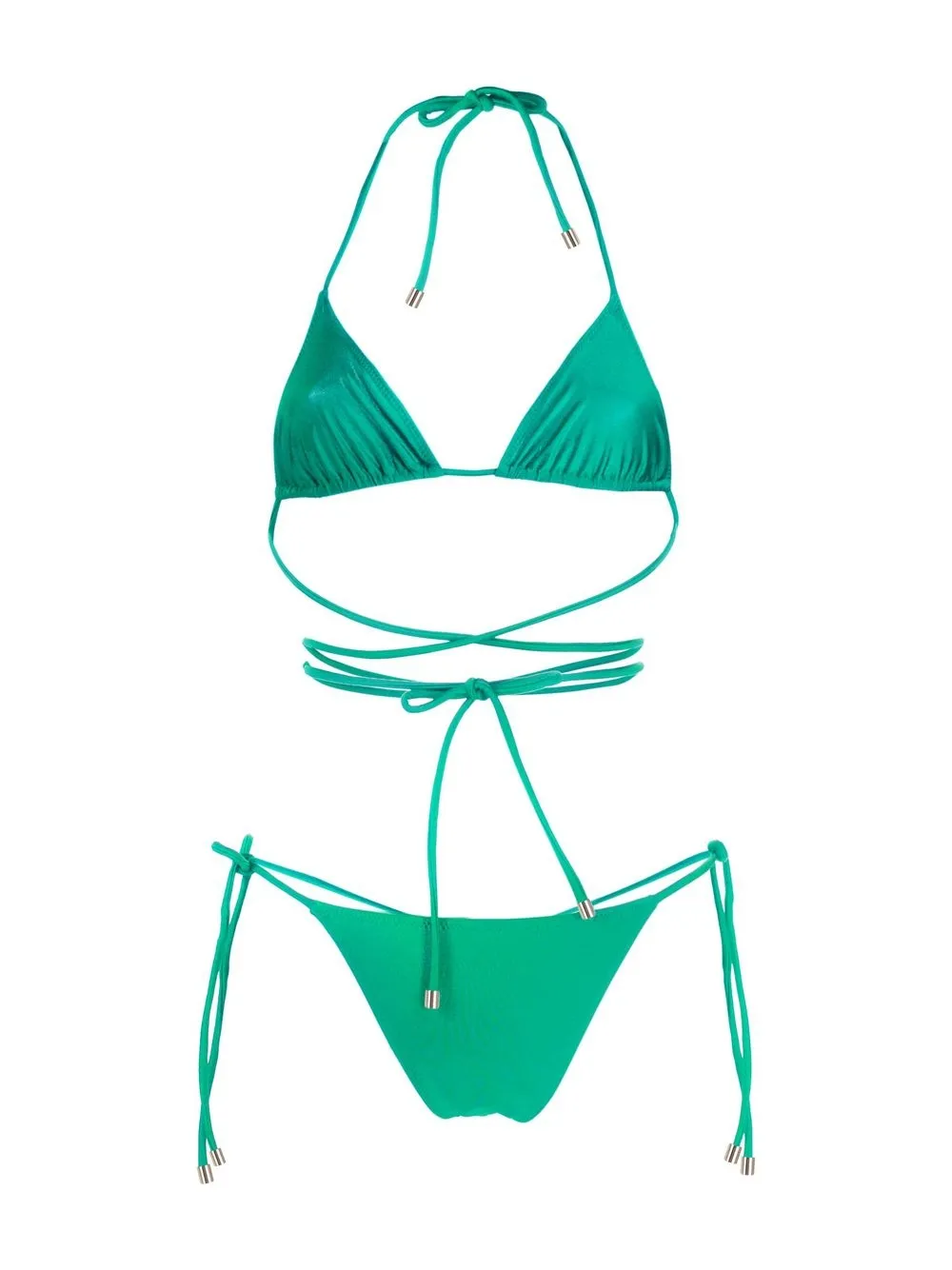 Smaragdgroen, stretch design, veelzijdige band, halternek striksluiting, V-vormige watervalhals, bikinislip met striksluiting aan de zijkant en low waist. Zwemkleding moet over je eigen kleding worden aangepast..