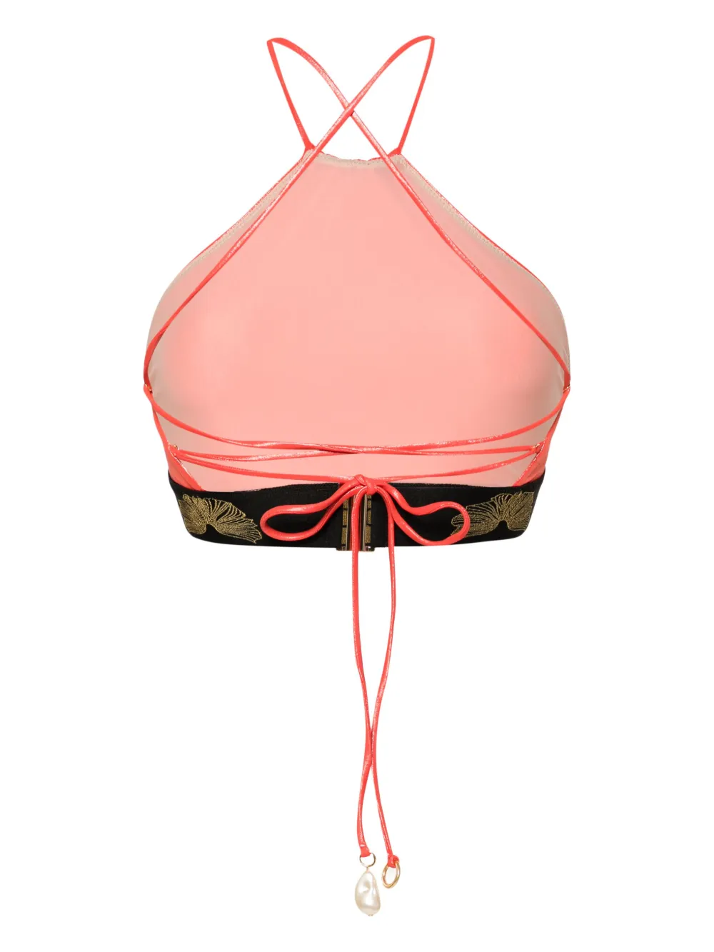 koraal stretch design glanzende finish gesmockte halsstrik elastische logoband gekruiste bandjes aan de achterkant striksluiting aan de achterkant sluiting aan de achterkant Zwemkleding moet over je eigen kleding worden aangepast.