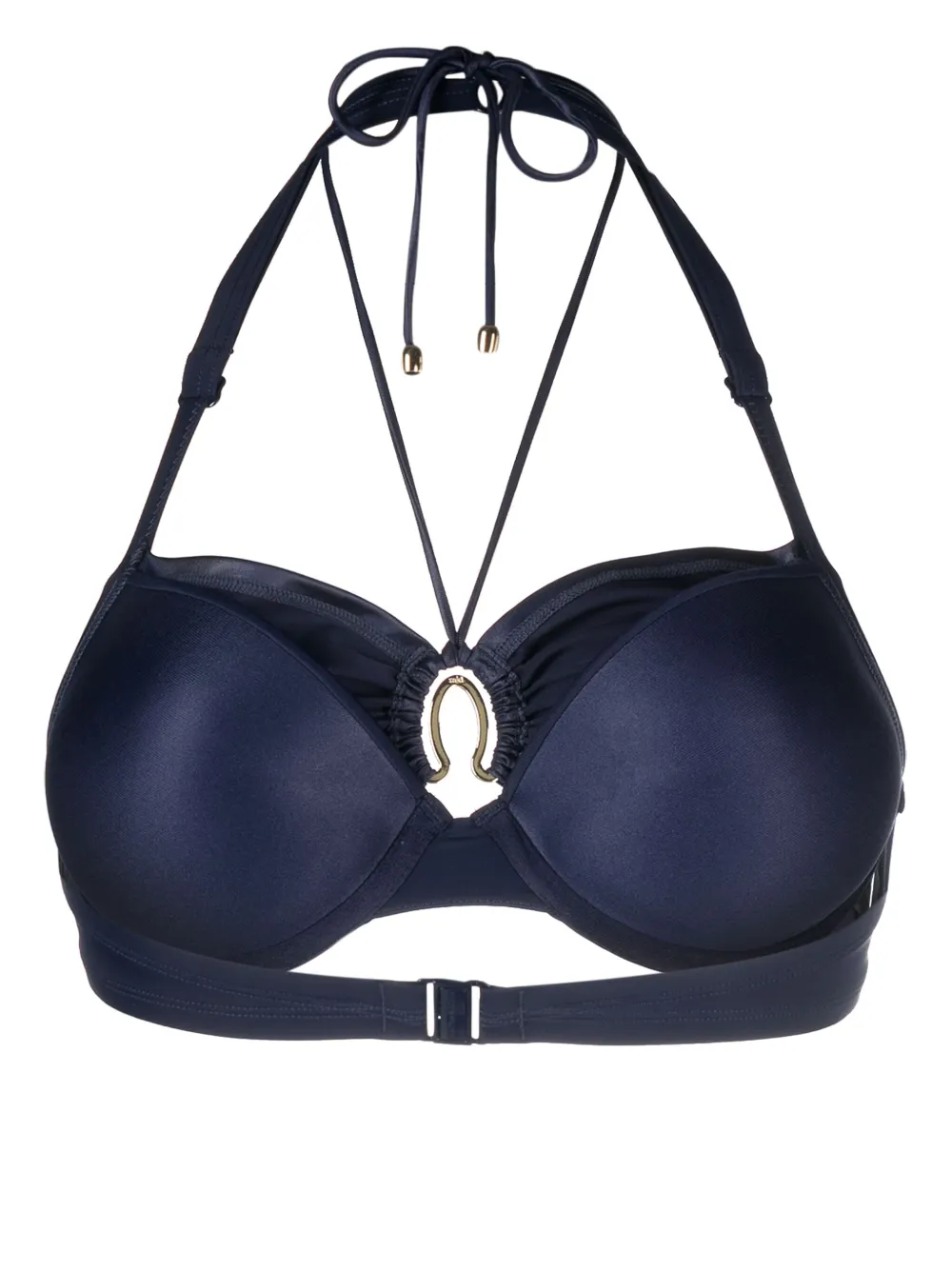 Nachtblauw, gerecyclede nylonmix, stretch design, plunge stijl, balconette stijl, halternek striksluiting, ringdetail en gespsluiting aan de achterkant. Zwemkleding moet over je eigen kleding worden aangepast.. .
