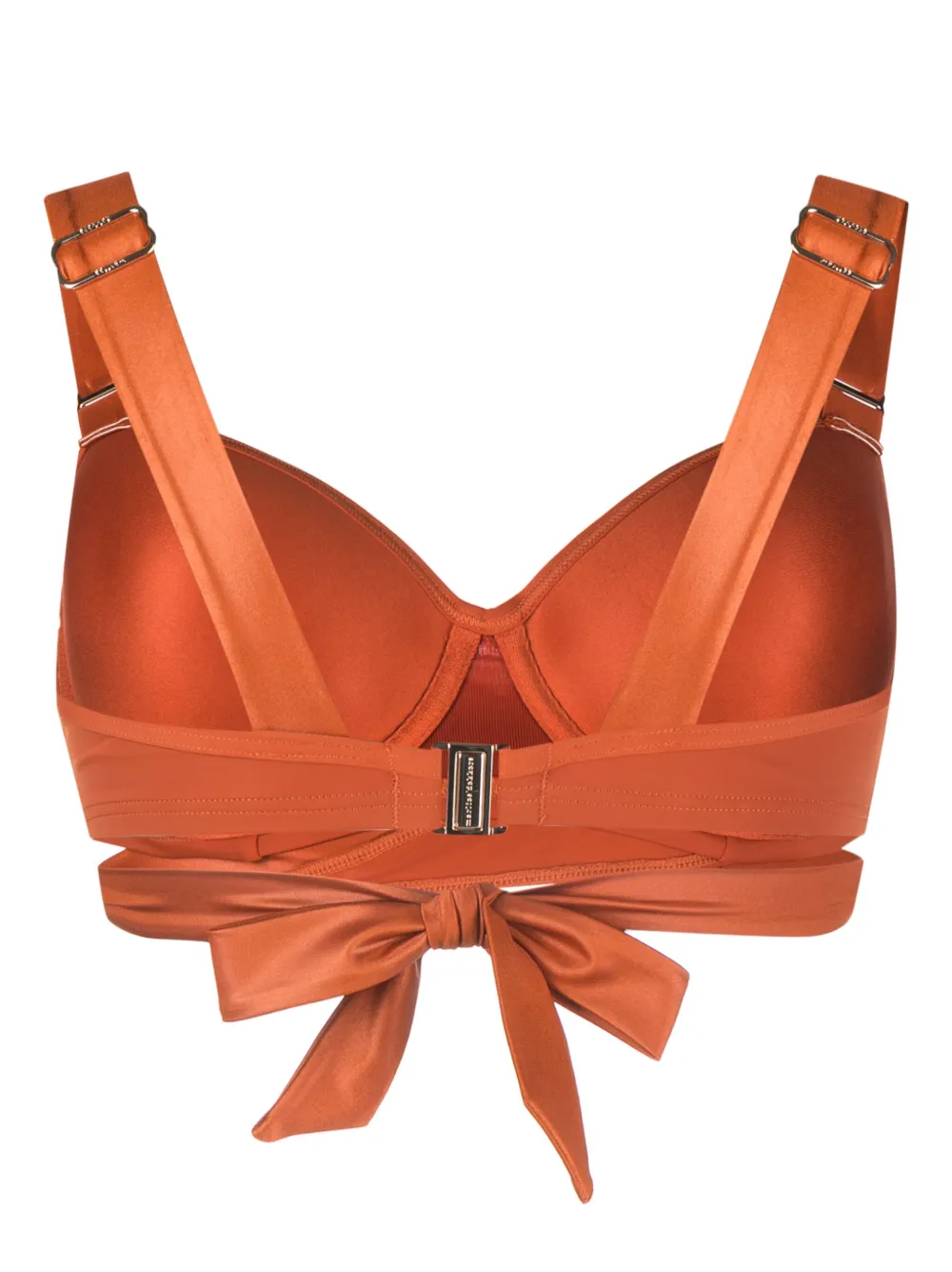 Donkeroranje, gerecyclede nylonmix, stretch design, gewatteerd design, wikkel design, verstelbare schouderbandjes, striksluiting aan de achterkant, sluiting aan de achterkant en beugelbeha. Zwemkleding moet over je eigen kleding worden aangepast.. . .