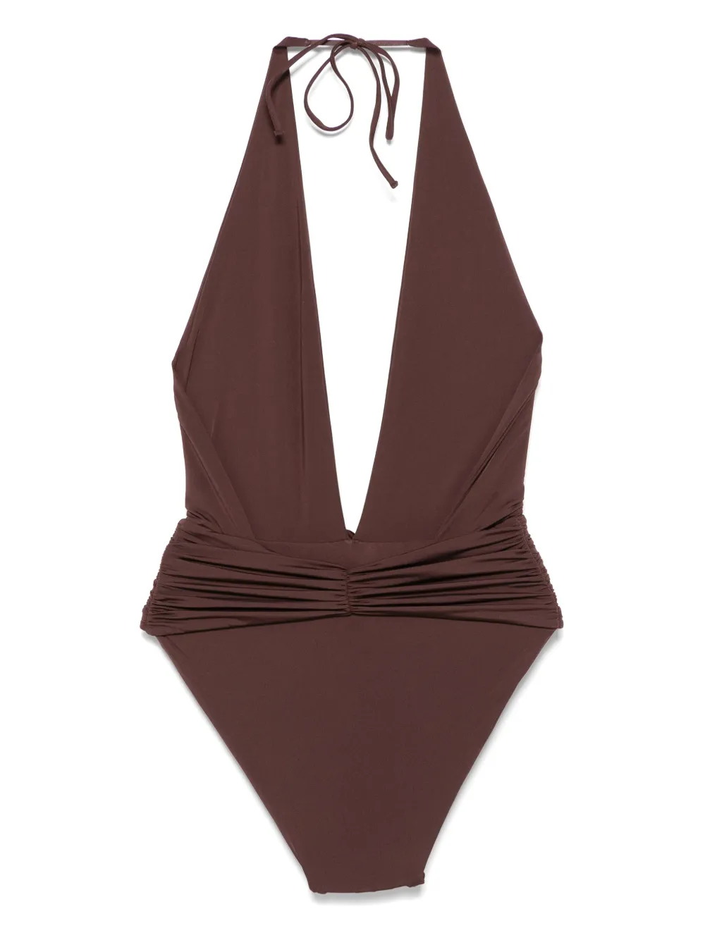 walnootbruin halternek striksluiting volledige voering detail met imitatiebloemen Zwemkleding moet over je eigen kleding worden aangepast.