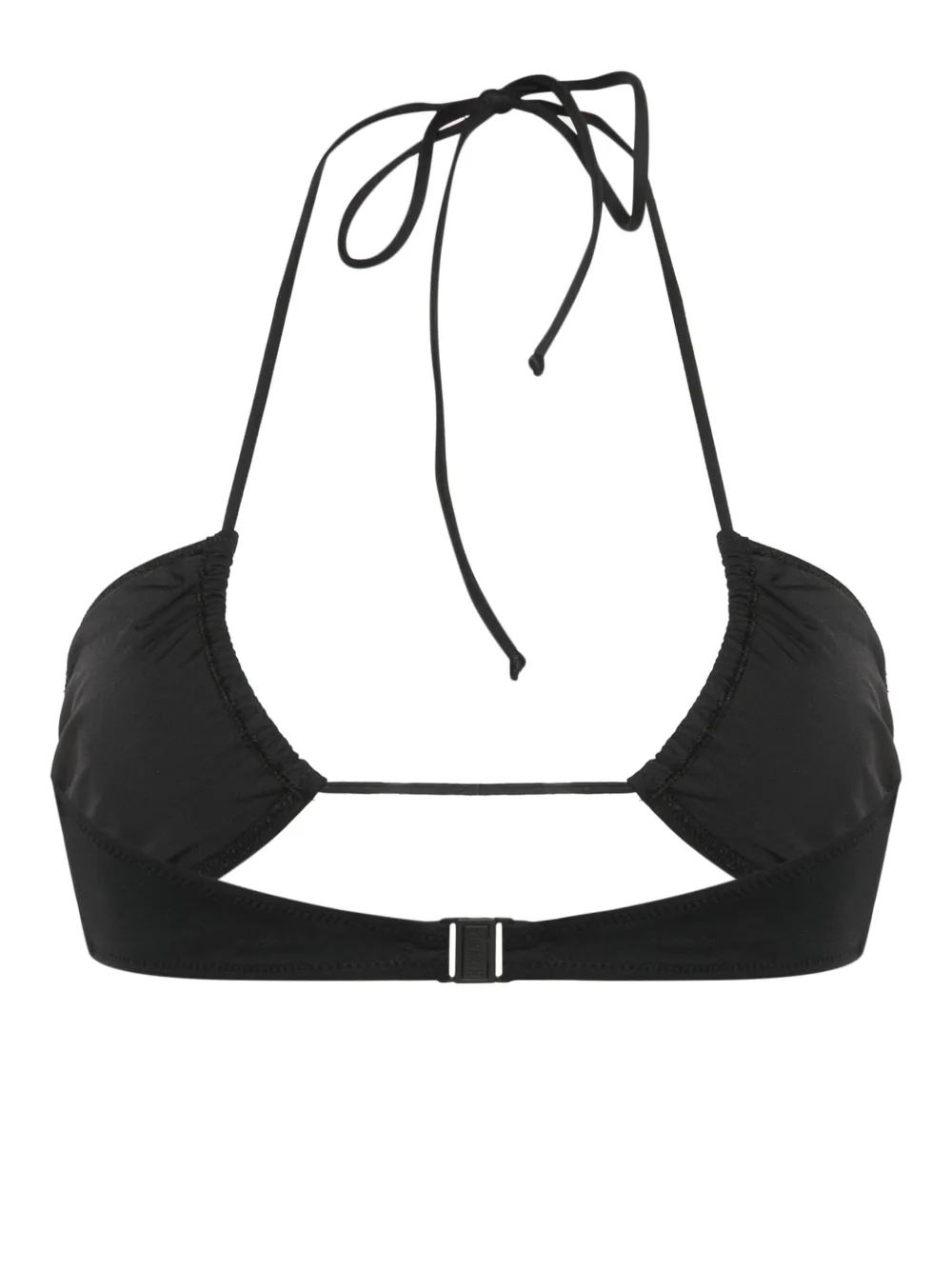 zwart stretch design halternek verstelbare schuifsluiting goudkleurige hardware met gegraveerd logo gespsluiting striksluiting aan de achterkant Zwemkleding moet over je eigen kleding worden aangepast.