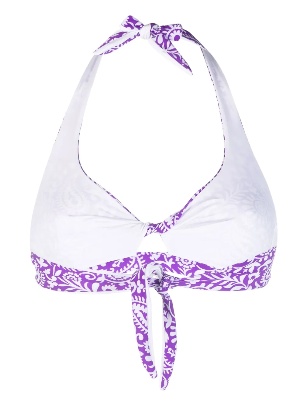 Violetpaars, wit, paisley-print, gedraaide details, halternek striksluiting en striksluiting aan de achterkant. Zwemkleding moet over je eigen kleding worden aangepast..