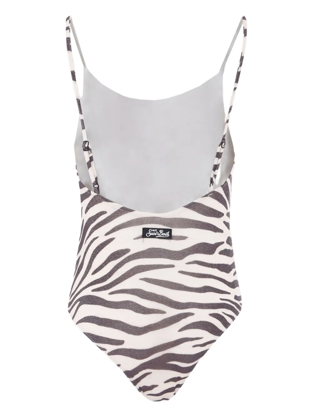 beige zebraprint spaghettibandjes lage rug label op de achterkant Zwemkleding moet over je eigen kleding worden aangepast.