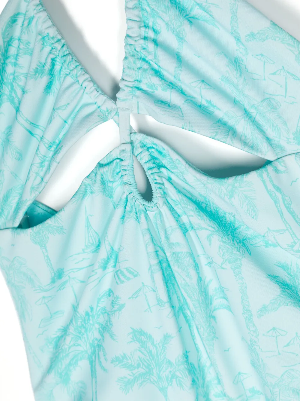 aqua blauw stretch design palmboomprint halternek striksluiting keyhole-hals uitgesneden detail open rug logopatch aan de achterkant volledige voering Zwemkleding moet over je eigen kleding worden aangepast.