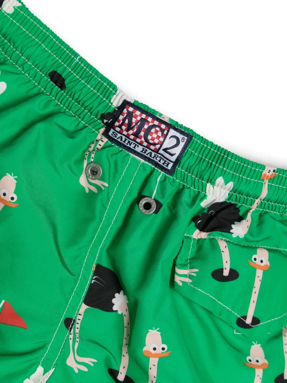 grasgroen gerecycled polyester golfer struisvogelprint elastische tailleband met trekkoord twee ingenaaide zijzakken klepzak achter rechte zoom mesh voering Zwemkleding moet over je eigen kleding worden aangepast.