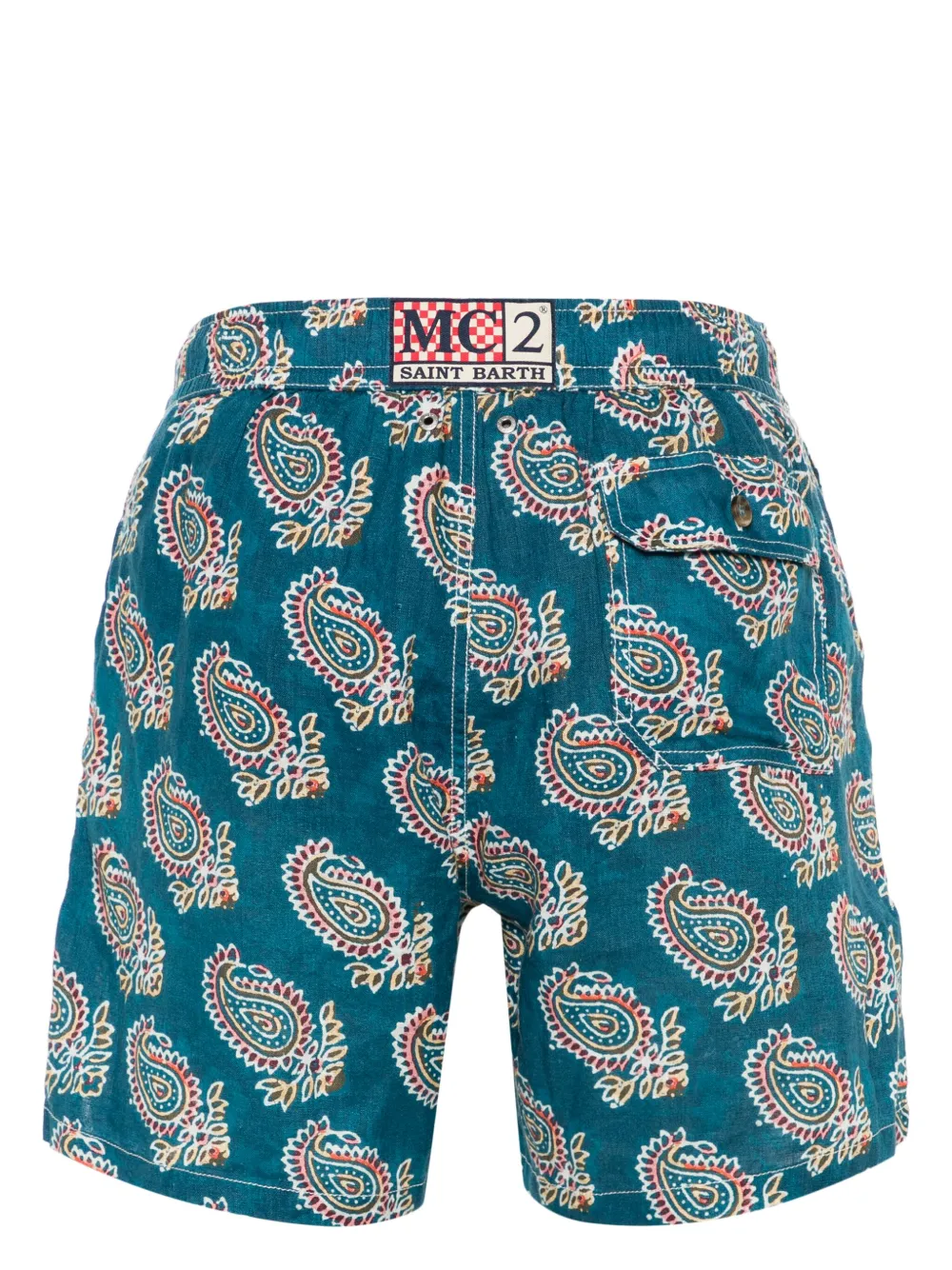 blauw/veelkleurig linnen/vlas paisley-print elastische tailleband met trekkoord twee ingenaaide zijzakken logopatch aan de achterkant klepzak aan de achterzijde volledige voering Zwemkleding moet over je eigen kleding worden aangepast.