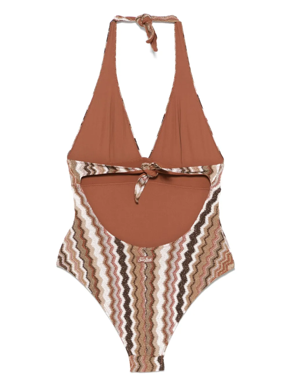 bruin halternek striksluiting zijstreep open rug Zwemkleding moet over je eigen kleding worden aangepast.