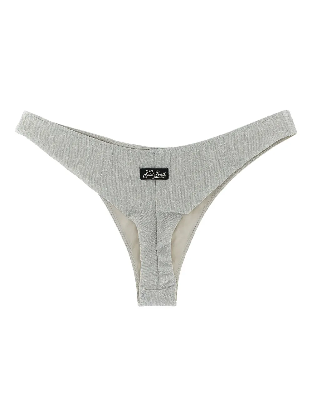 zilverkleurig lurex stof klein design minimale bedekking low-rise logopatch aan de achterkant Zwemkleding moet over je eigen kleding worden aangepast.