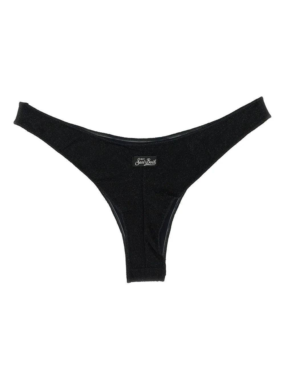 zwart gekreukte lurex stof klein design minimale bedekking low-rise logopatch Zwemkleding moet over je eigen kleding worden aangepast.