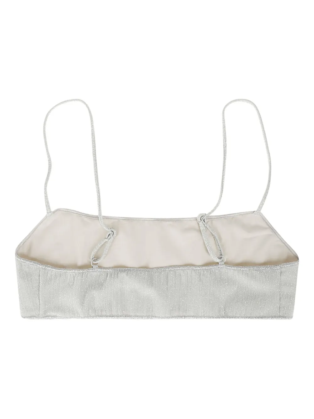 zilverkleurig lurex detail dunne bandjes vierkante hals rechte zoom nauwsluitend Zwemkleding moet over je eigen kleding worden aangepast.
