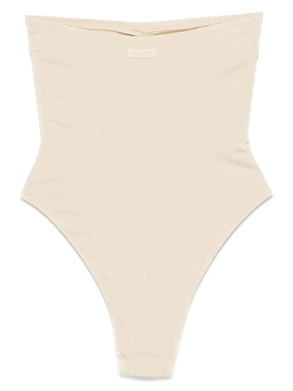 zandbeige instapmodel ruchedetails Zwemkleding moet over je eigen kleding worden aangepast.