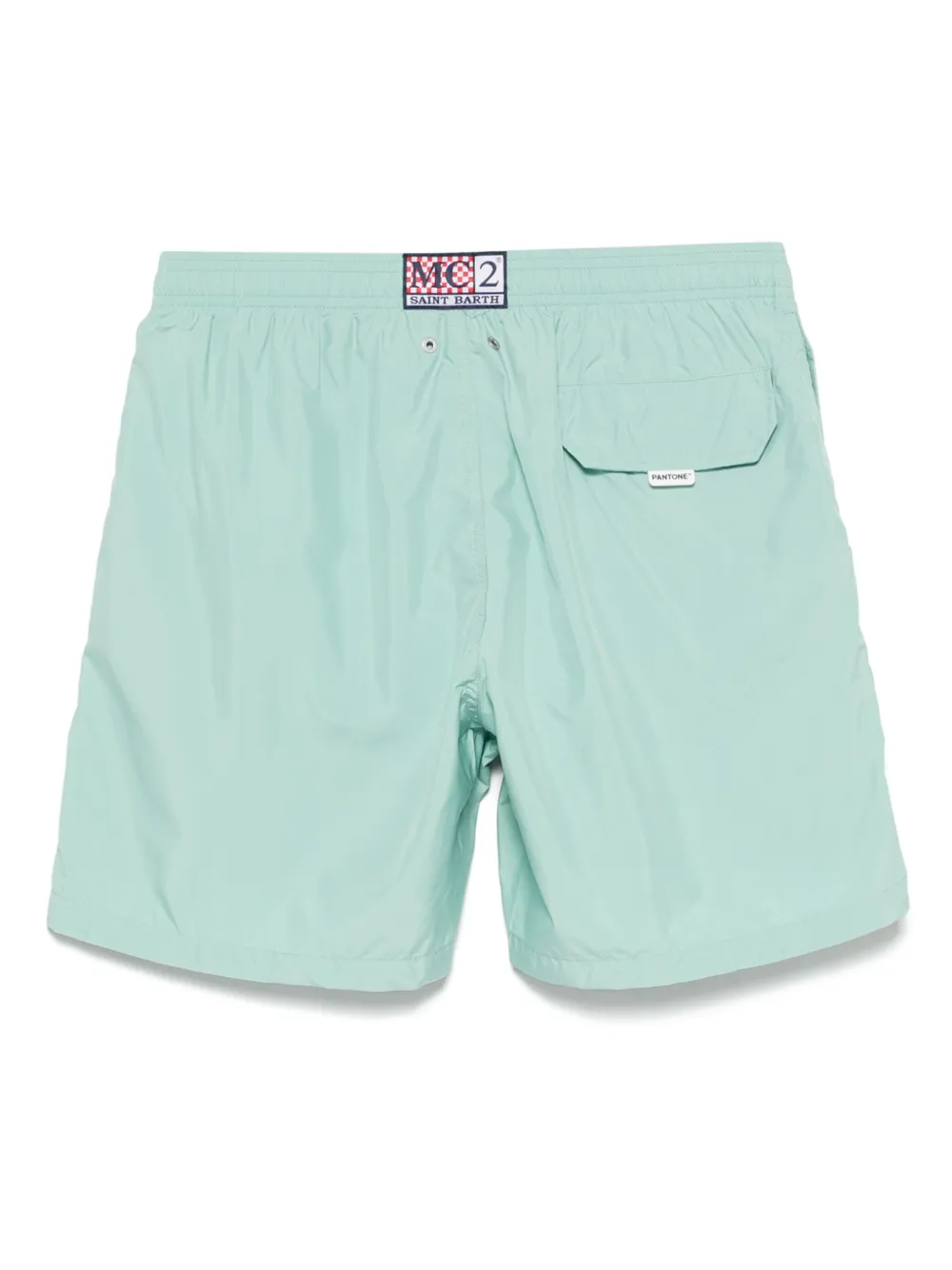muntgroen elastische tailleband met trekkoord twee steekzakken aan de zijkant klepzak aan de achterkant Zwemkleding moet over je eigen kleding worden aangepast.