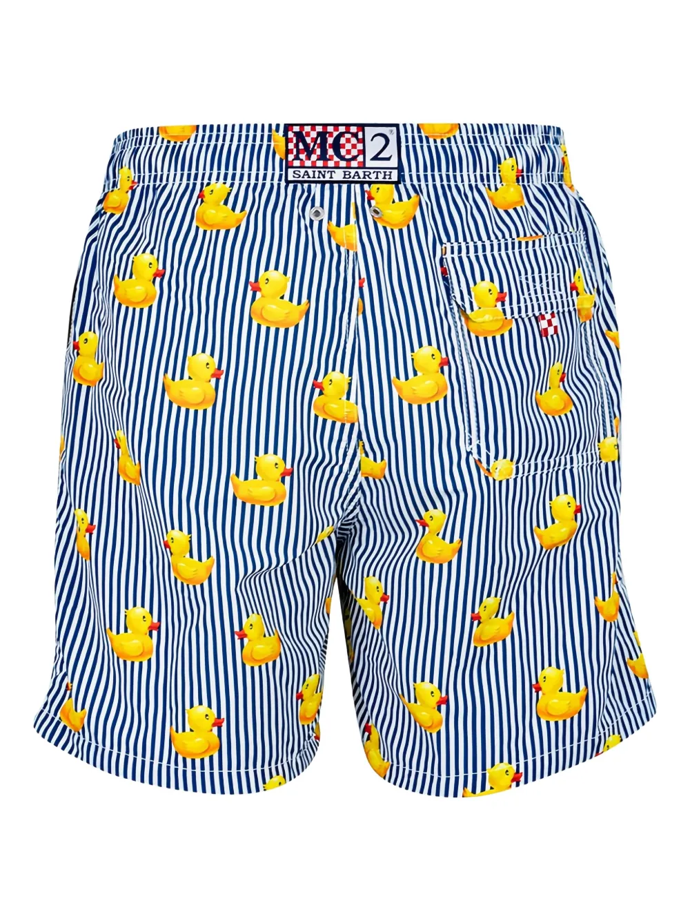 blauw rubberen eend-print verticale strepen trekkoordsluiting zijzakken achterzak Zwemkleding moet over je eigen kleding worden aangepast.