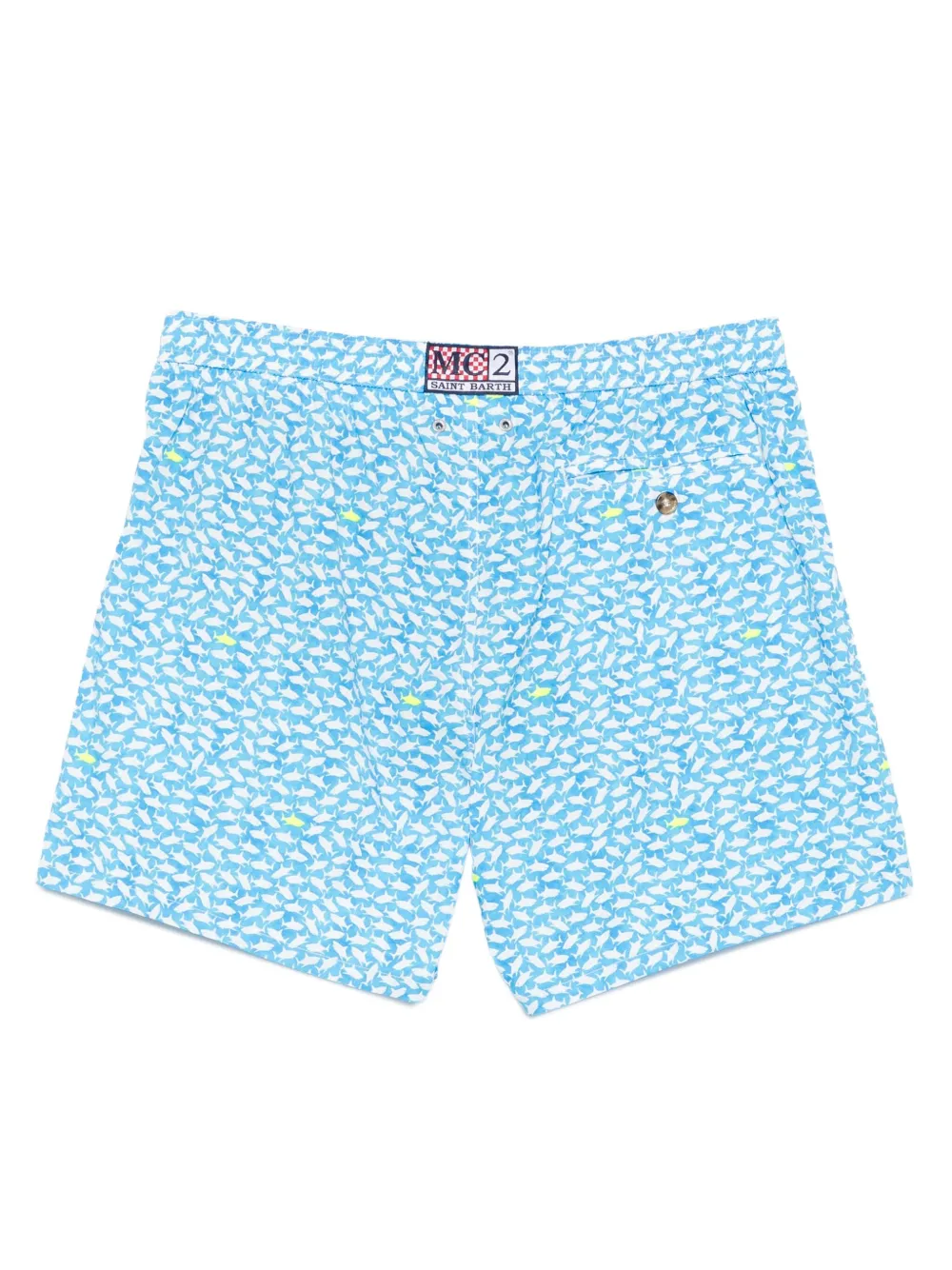blauw/wit all-over visprint elastische tailleband met trekkoord paspelzak aan de achterkant logopatch aan de achterkant Zwemkleding moet over je eigen kleding worden aangepast.