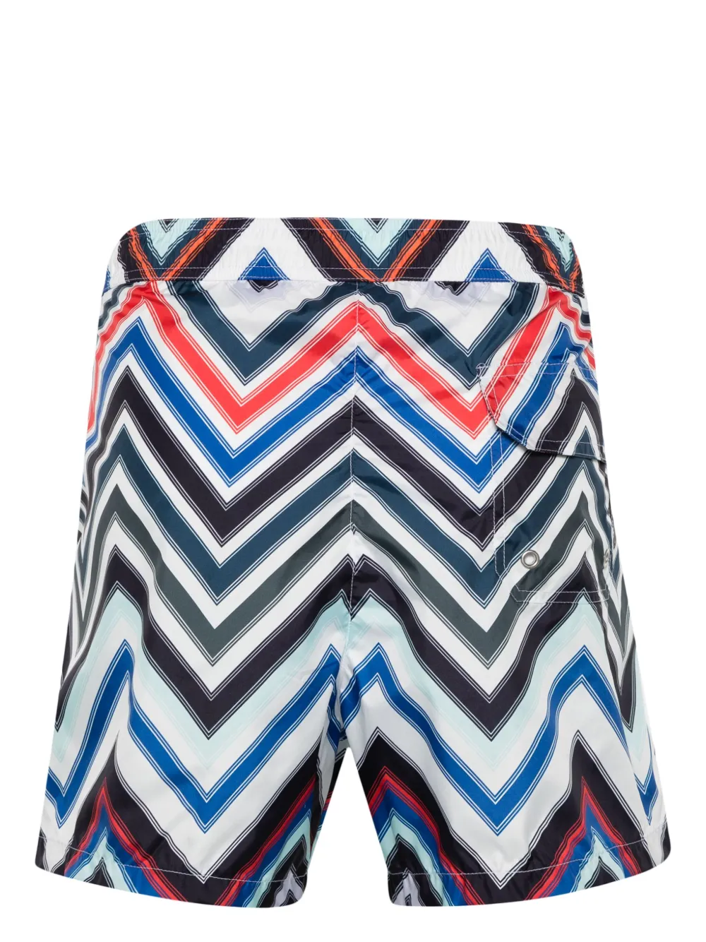 wit/veelkleurig kenmerkend zigzag geweven design elastische tailleband met trekkoord twee steekzakken aan de zijkant opgestikte zak aan de achterkant mesh voering klittenbandsluiting aan de voorkant Zwemkleding moet over je eigen kleding worden aangepast. Het item dat u ontvangt kan enigszins afwijken van het gefotografeerde item. Dit komt door de ambachtelijke wijze waarop alle Missoni producten zijn vervaardigd.