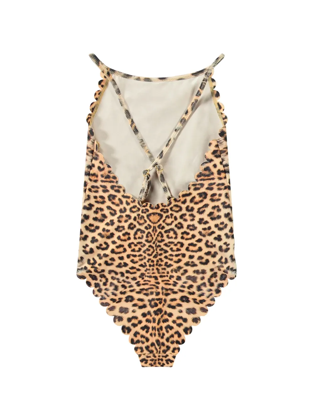 zwart/beige gerecyclede polyesterblend stretch design luipaardprint ronde hals gekruiste bandjes aan de achterkant Zwemkleding moet over je eigen kleding worden aangepast.