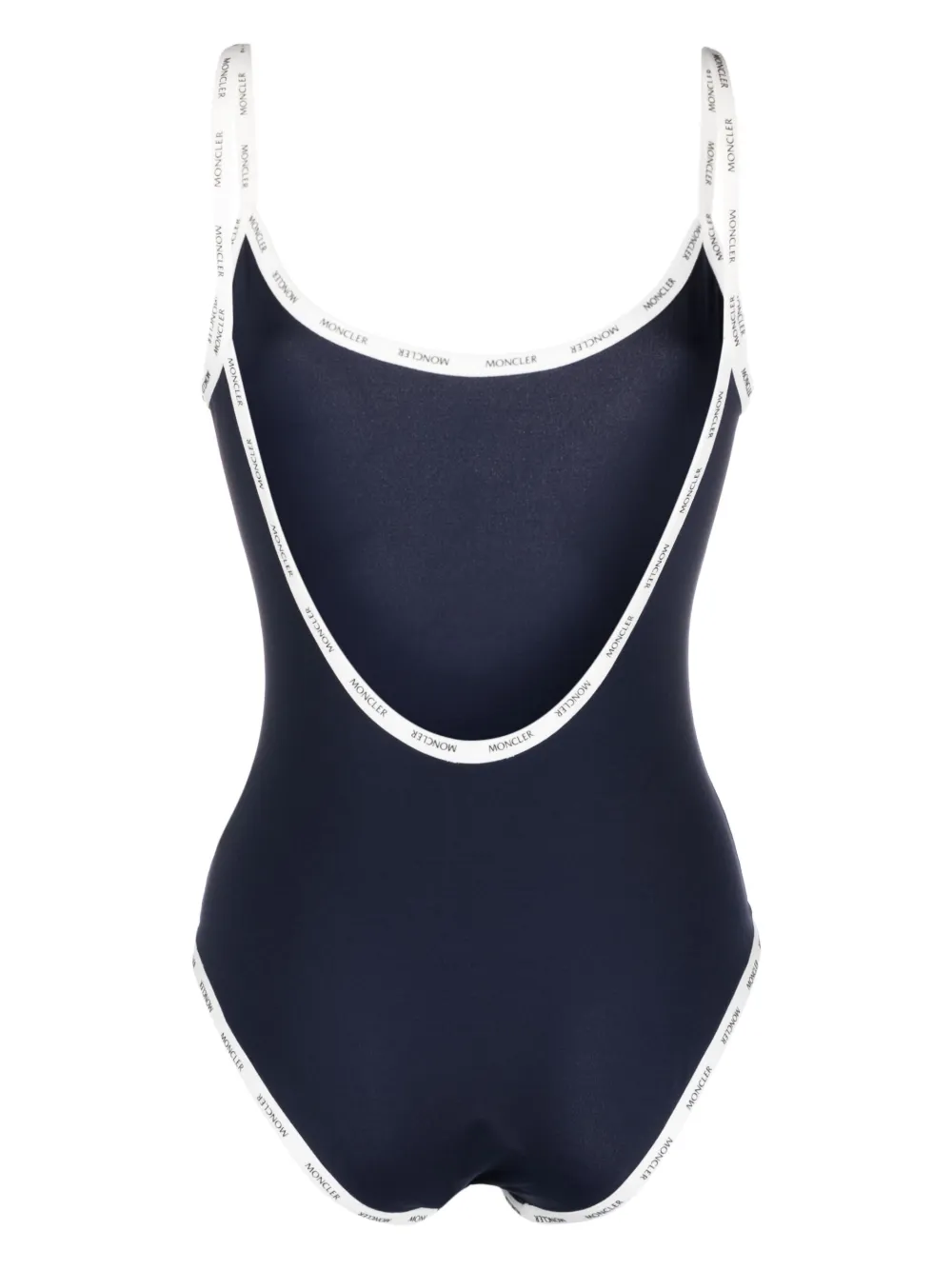 Marineblauw, stretch design, logoband detail, U-hals, spaghettibandjes en open rug. Zwemkleding moet over je eigen kleding worden aangepast..