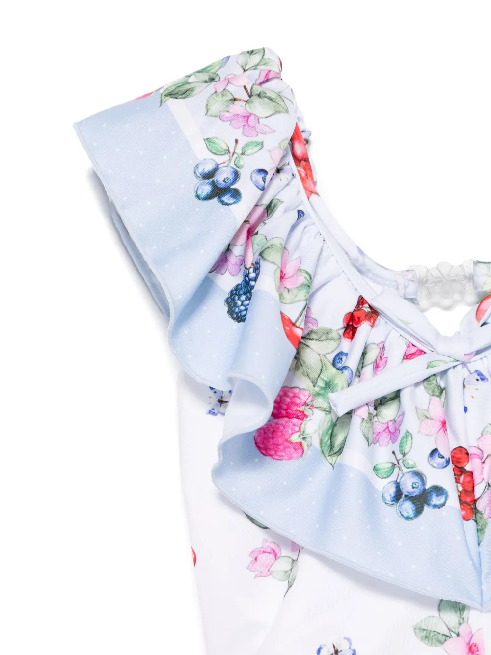 wit/veelkleurig stretch design technische jersey bloemenprint all-over fruitprint sluiting aan de achterkant diepe ronde hals ruches strikdetail aan de voorkant logo bedel open rug ruchedetails aan de achterkant volledige voering badpak design Zwemkleding moet over je eigen kleding worden aangepast. Dit item wordt verkocht met een beschermhoes.
