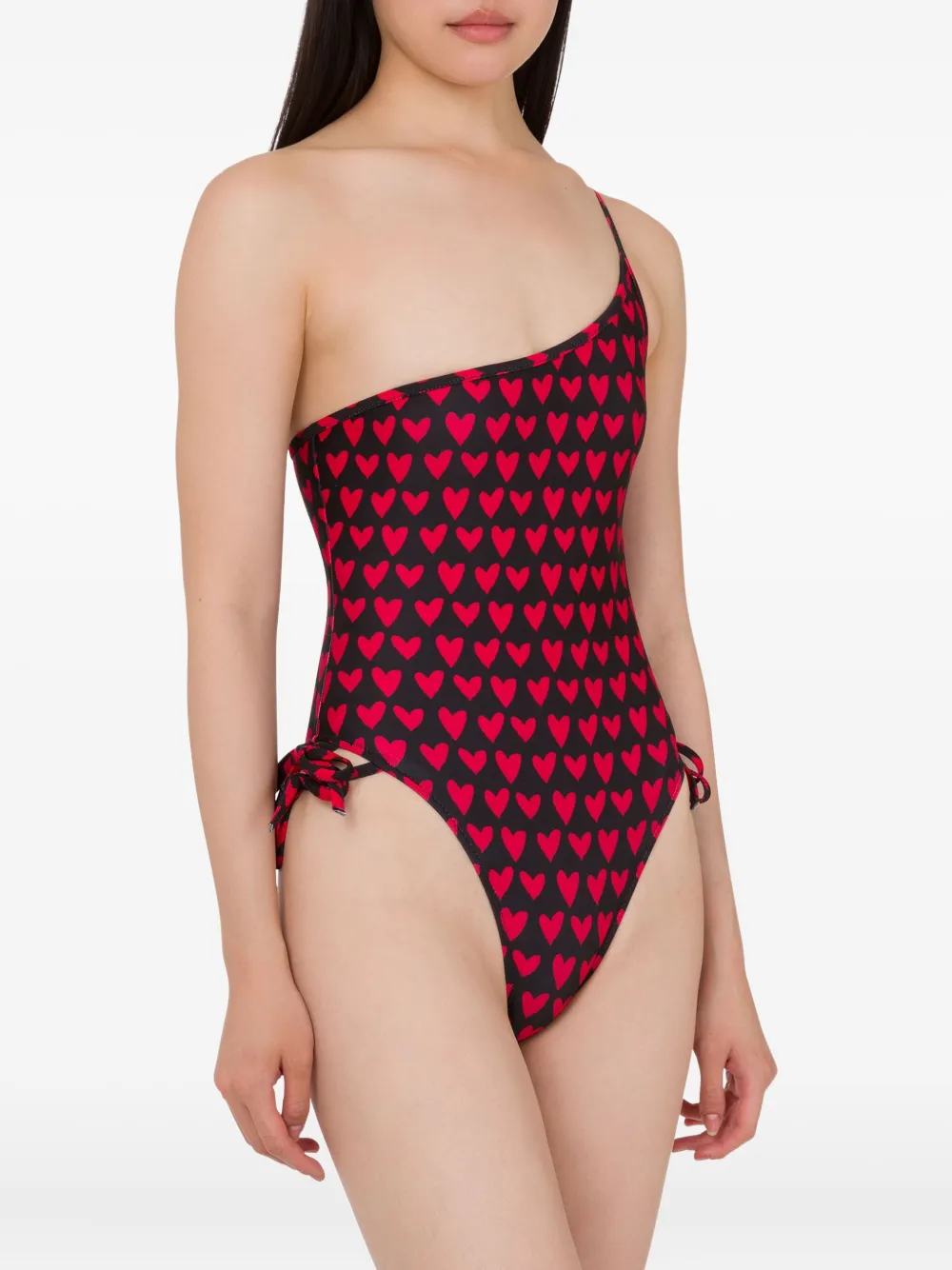 zwart/rood all-over rode hartprint asymmetrisch design strikdetails aan de zijkant hoog uitgesneden Zwemkleding moet over je eigen kleding worden aangepast.