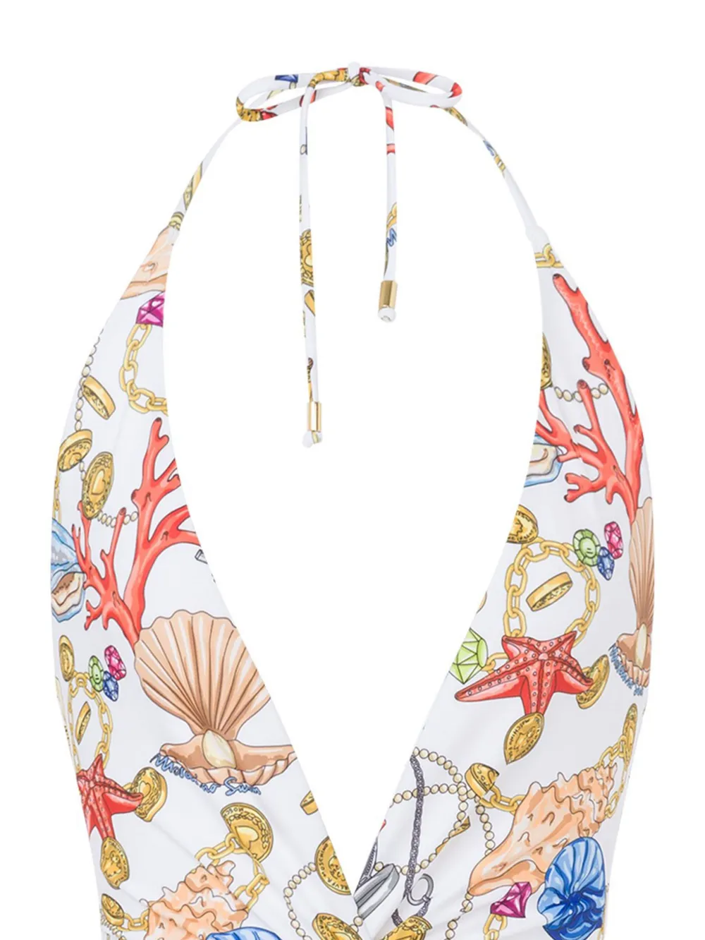 wit/veelkleurig stretch design schelpenprint halternek striksluiting V-vormige watervalhals hoog uitgesneden open rug Zwemkleding moet over je eigen kleding worden aangepast.