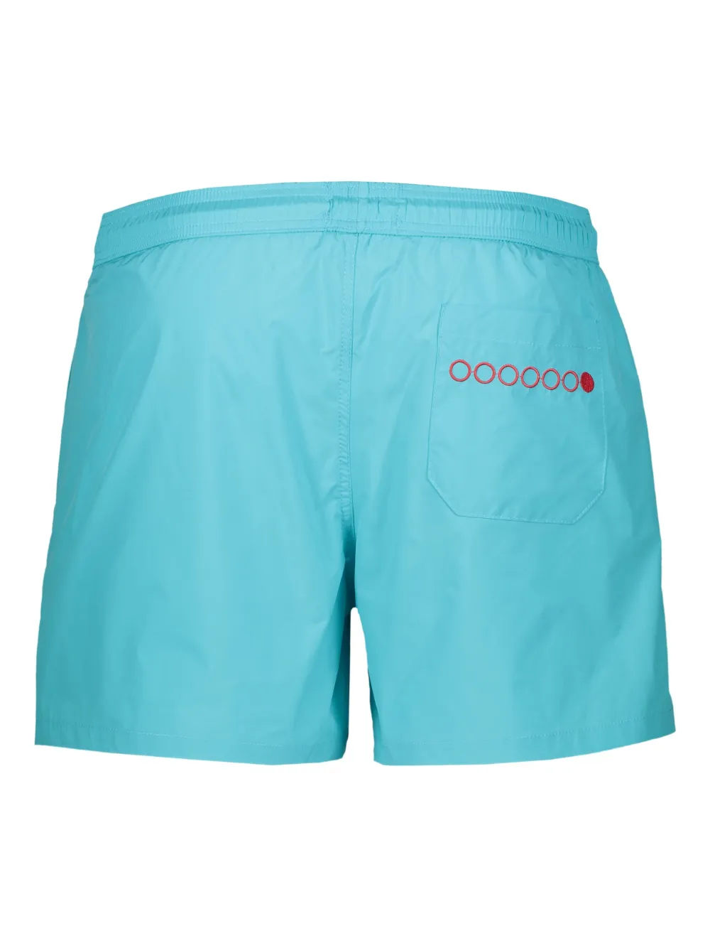 lichtblauw elastische tailleband met trekkoord twee zijzakken achterzak letterprint rood cirkelvormig patroon Zwemkleding moet over je eigen kleding worden aangepast.