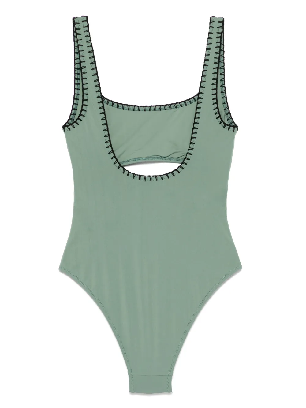 zeegroen uitgesneden detail afgewerkte zoom Zwemkleding moet over je eigen kleding worden aangepast.