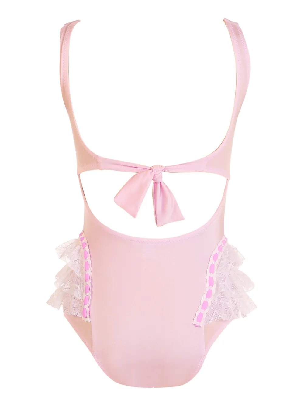 lichtroze striksluiting aan de achterkant diepe ronde hals open rug Zwemkleding moet over je eigen kleding worden aangepast.