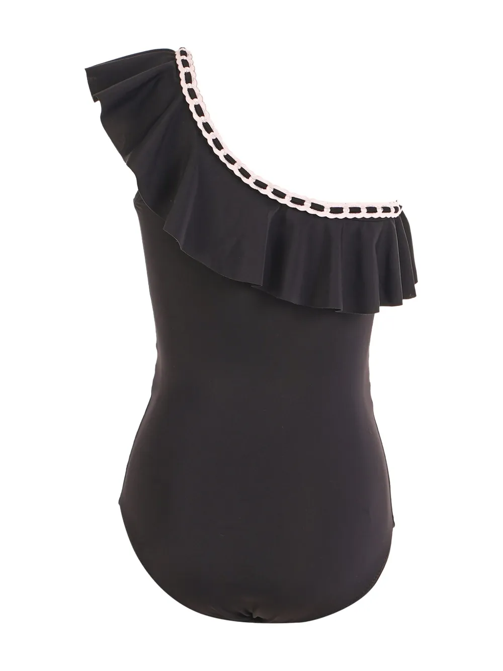 zwart decoratief gespdetail enkele schouder Zwemkleding moet over je eigen kleding worden aangepast.