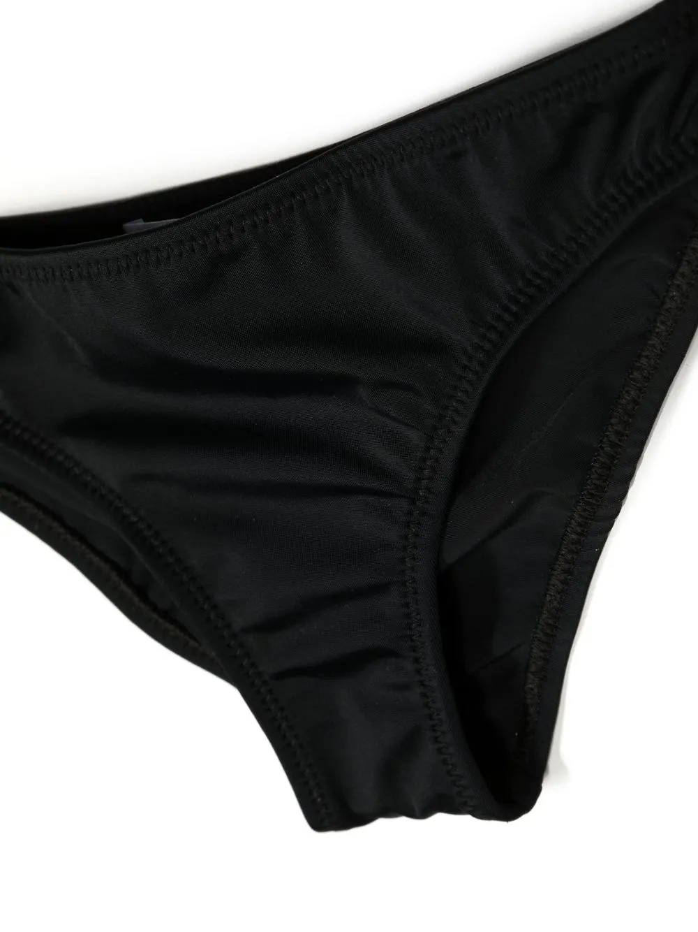 Zwart/wit, stretch design, tweekleurig design, ruche details, vierkante hals, brede schouderbandjes, rechte zoom, cropped en klassieke bikinislip. Zwemkleding moet over je eigen kleding worden aangepast..