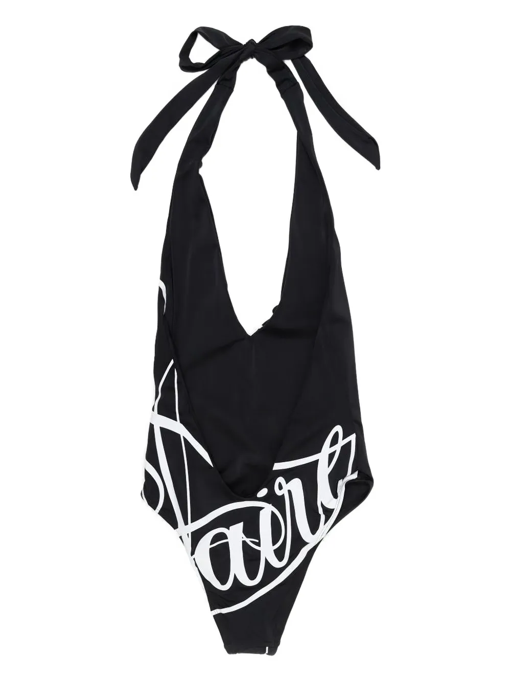 zwart V-vormige watervalhals open rug halternek striksluiting Zwemkleding moet over je eigen kleding worden aangepast.
