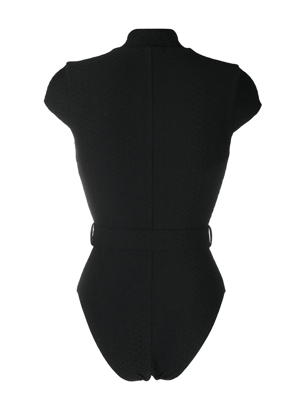 Slangenhuidprint, col, ritssluiting aan de voorzijde, gespsluiting aan de voorzijde, korte mouwen , stretch-fit en volledige voering. Wij verzoeken je om zwemkleding over je eigen ondergoed aan te passen..