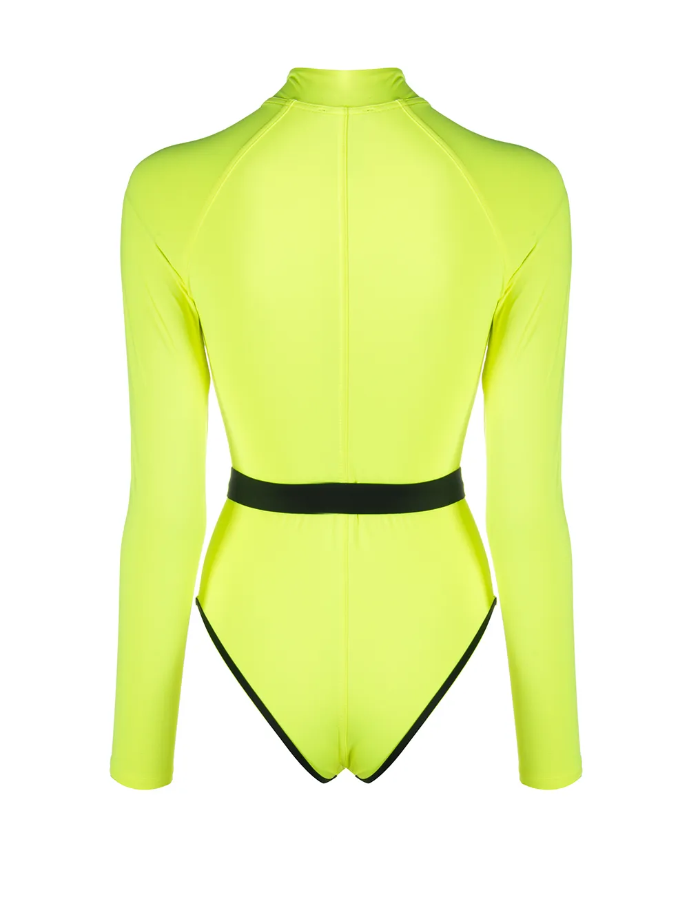 Hoge hals, ritssluiting aan de voorzijde, lange raglan mouwen, contrasterende afwerking, hoog uitgesneden en volledige voering. Wij verzoeken je om zwemkleding over je eigen ondergoed aan te passen..