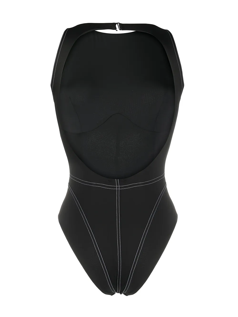 Ronde hals, contrasterende stiksels, haaksluiting aan de achterkant, open rug, hoog uitgesneden en volledige voering. Wij verzoeken je om zwemkleding over je eigen ondergoed aan te passen..