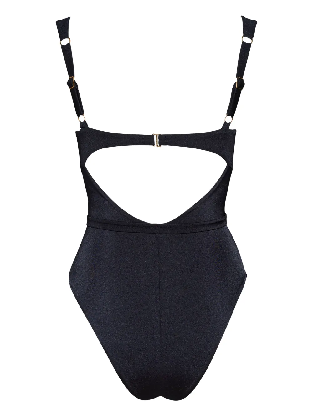 zwart stretch design schelp gespdetail ruchedetails balconette stijl verstelbare schouderbandjes sluiting aan de achterkant open rug taille met ceintuur hoog uitgesneden volledige voering goudkleurige hardware Zwemkleding moet over je eigen kleding worden aangepast.