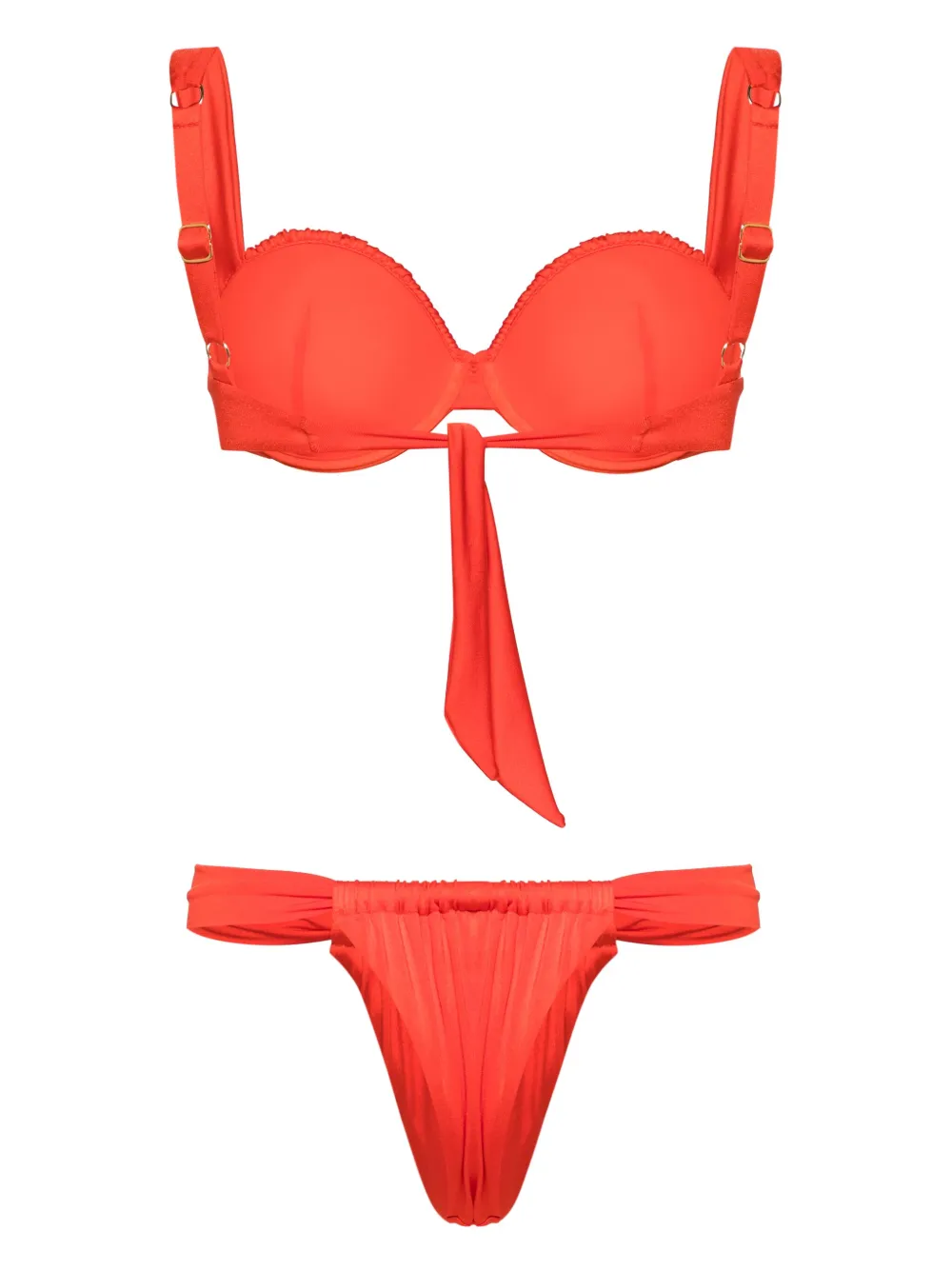 lava-oranje stretch designTop: ruchedetails balconette stijl verstelbare schouderbandjes striksluiting aan de achterkantBroek gesmockte details tanga stijl Zwemkleding moet over je eigen kleding worden aangepast.