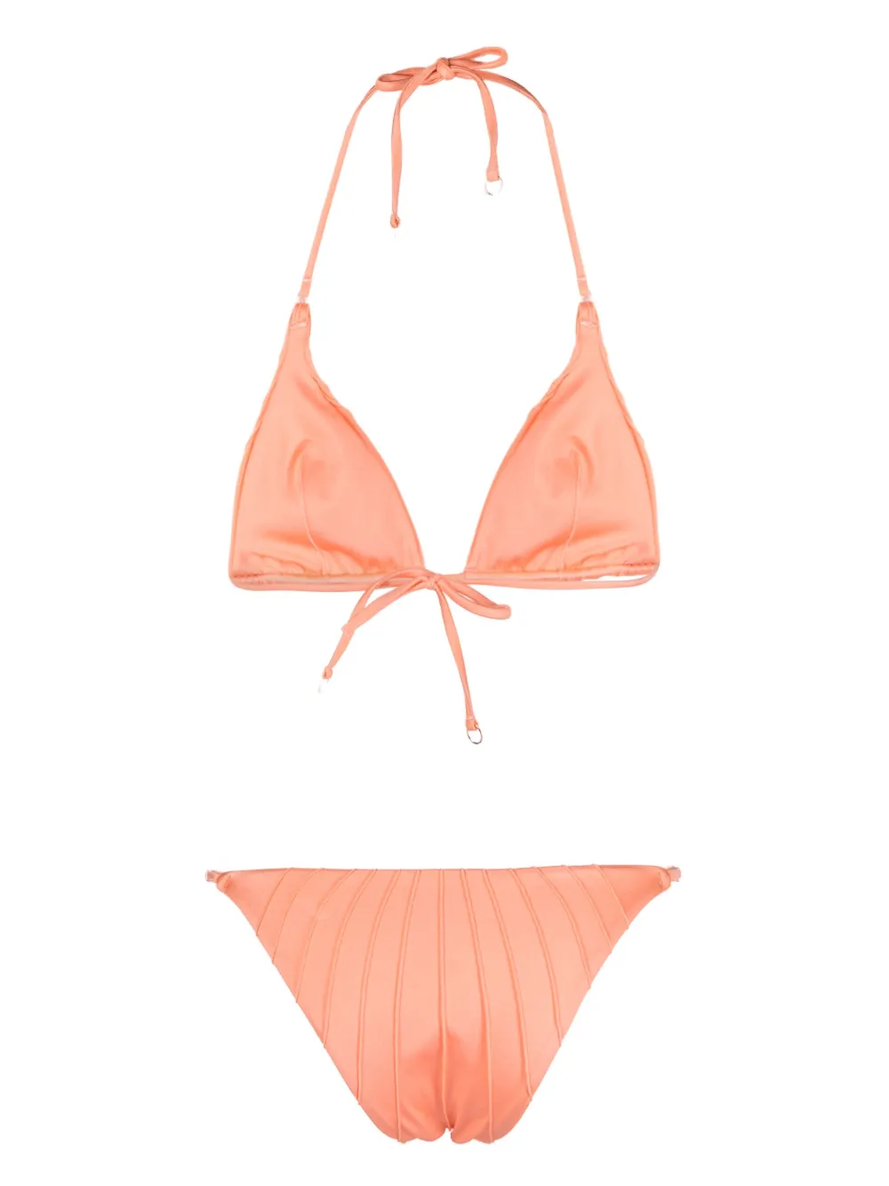 Oranje, stretch design, gesmockte details, triangel cup, halternek striksluiting, striksluiting aan de achterkant en low waist. Zwemkleding moet over je eigen kleding worden aangepast..