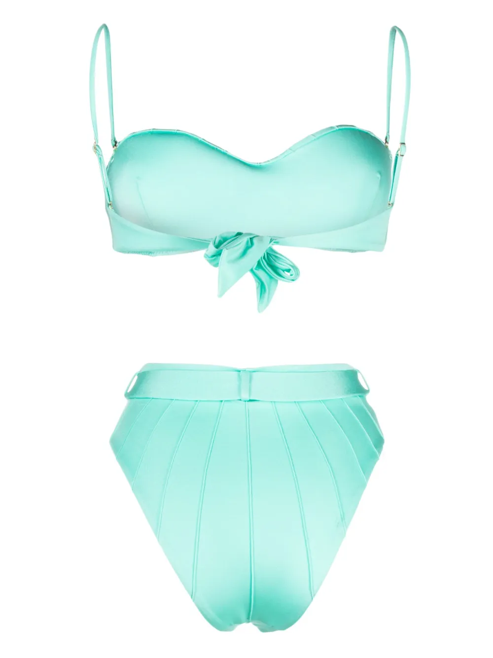 Turkoois, stretch design, zoomdetail, sweetheart-hals, twee verstelbare schouderbanden, striksluiting aan de achterkant, taille met ceintuur en high waist bikinislip. Zwemkleding moet over je eigen kleding worden aangepast..