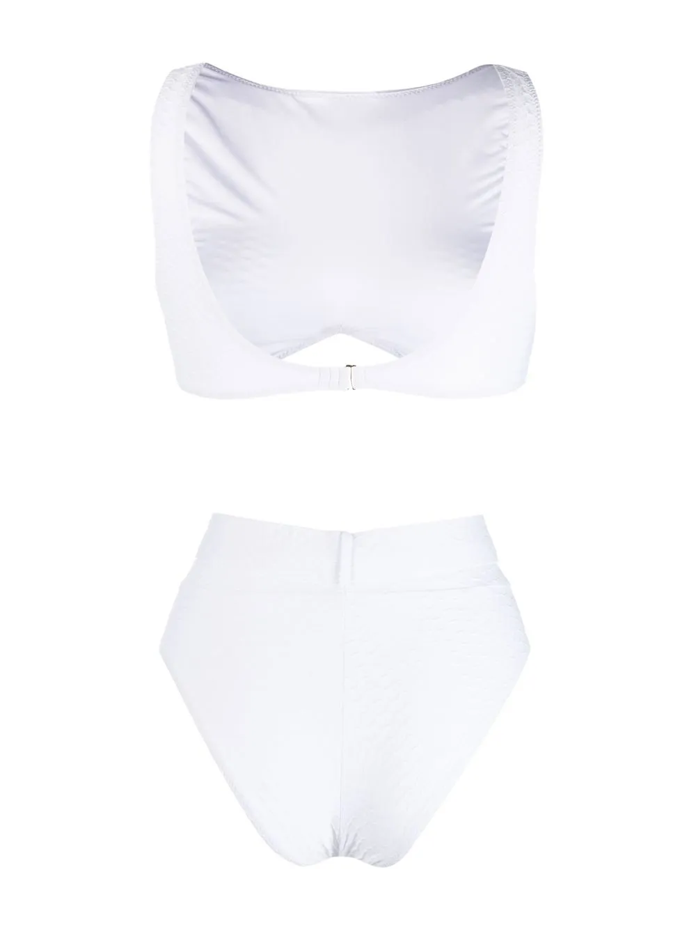 Wit, ronde hals, mouwloos, uitgesneden detail , sluiting aan de achterkant, high waist bikinislip en taille met ceintuur. Zwemkleding moet over je eigen kleding worden aangepast..