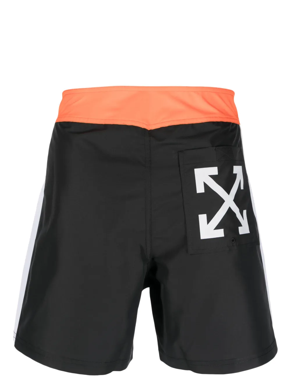 Zwart, oranje, blauw, elastische tailleband met trekkoord, logoprint aan de zijkant, twee steekzijzakken, twee opgestikte achterzakken, kenmerkend Arrows patroon en dijlengte. Zwemkleding moet over je eigen kleding worden aangepast..
