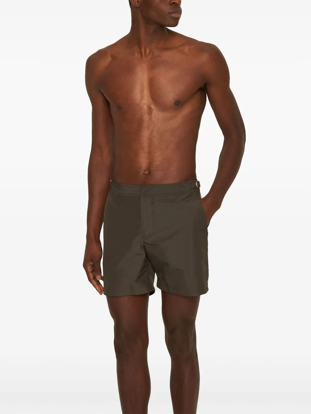 cederbruin gerecycled polyester verborgen sluiting aan de voorkant twee steekzakken aan de zijkant twee paspelzakken aan de achterkant dijlengte Zwemkleding moet over je eigen kleding worden aangepast.