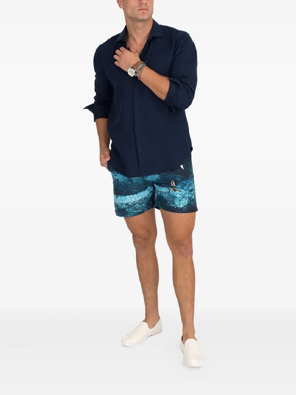 marineblauw/turkoois snel drogend fotoprint taille tabs twee steekzakken aan de zijkant logolabel aan de zijkant korte zijsplitten dijlengte achterzak met ritssluiting locker lus aan de achterzijde mesh voering drukknoopsluiting en rits aan de voorkant Zwemkleding moet over je eigen kleding worden aangepast. Dit item wordt verkocht met een beschermhoes.