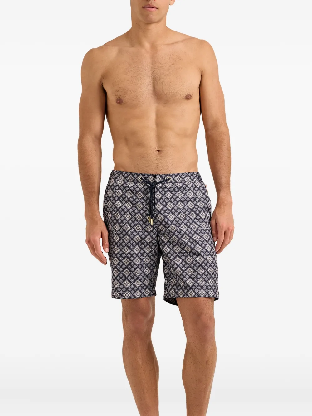 marineblauw trekkoordtaille all-over geometrisch geborduurd patroon zijzakken achterzak Zwemkleding moet over je eigen kleding worden aangepast.