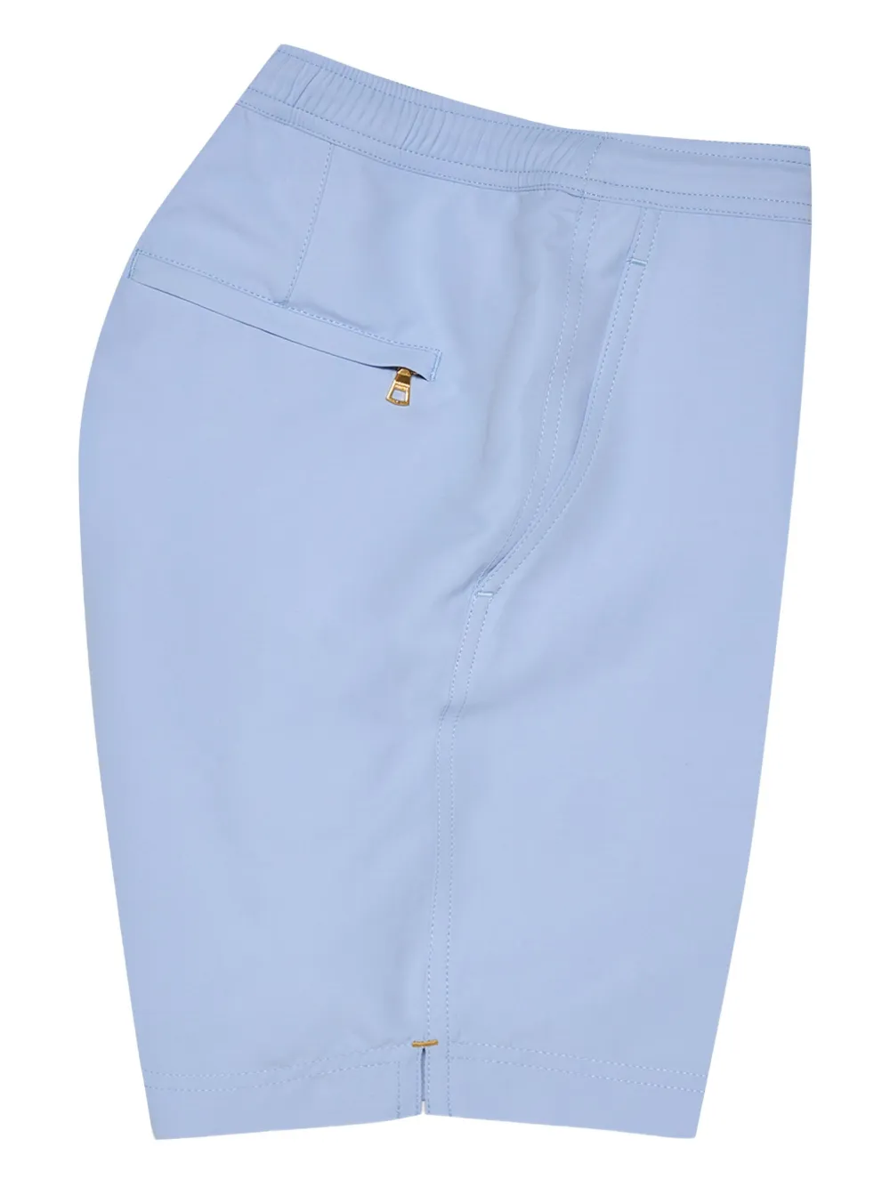 lichtblauw verstelbaar trekkoord steekzijzakken opgestikte zak aan de achterkant goudkleurige schakelsluiting Zwemkleding moet over je eigen kleding worden aangepast.