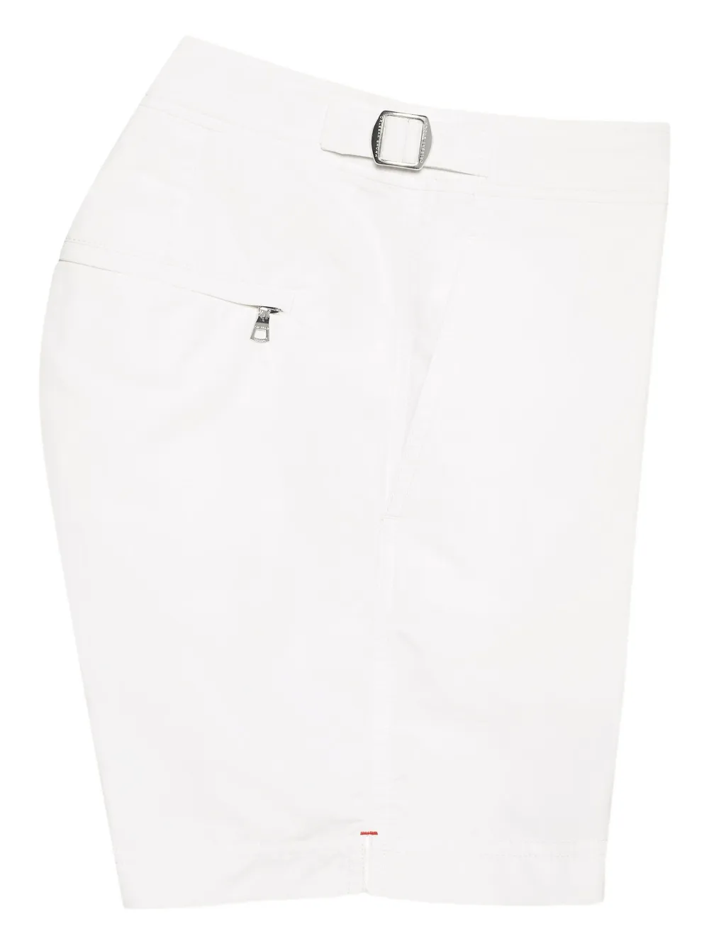 Wit, taille tabs, verborgen sluiting aan de voorkant, twee steekzijzakken, achterzak met ritssluiting en zijsplitten. Zwemkleding moet over je eigen kleding worden aangepast..