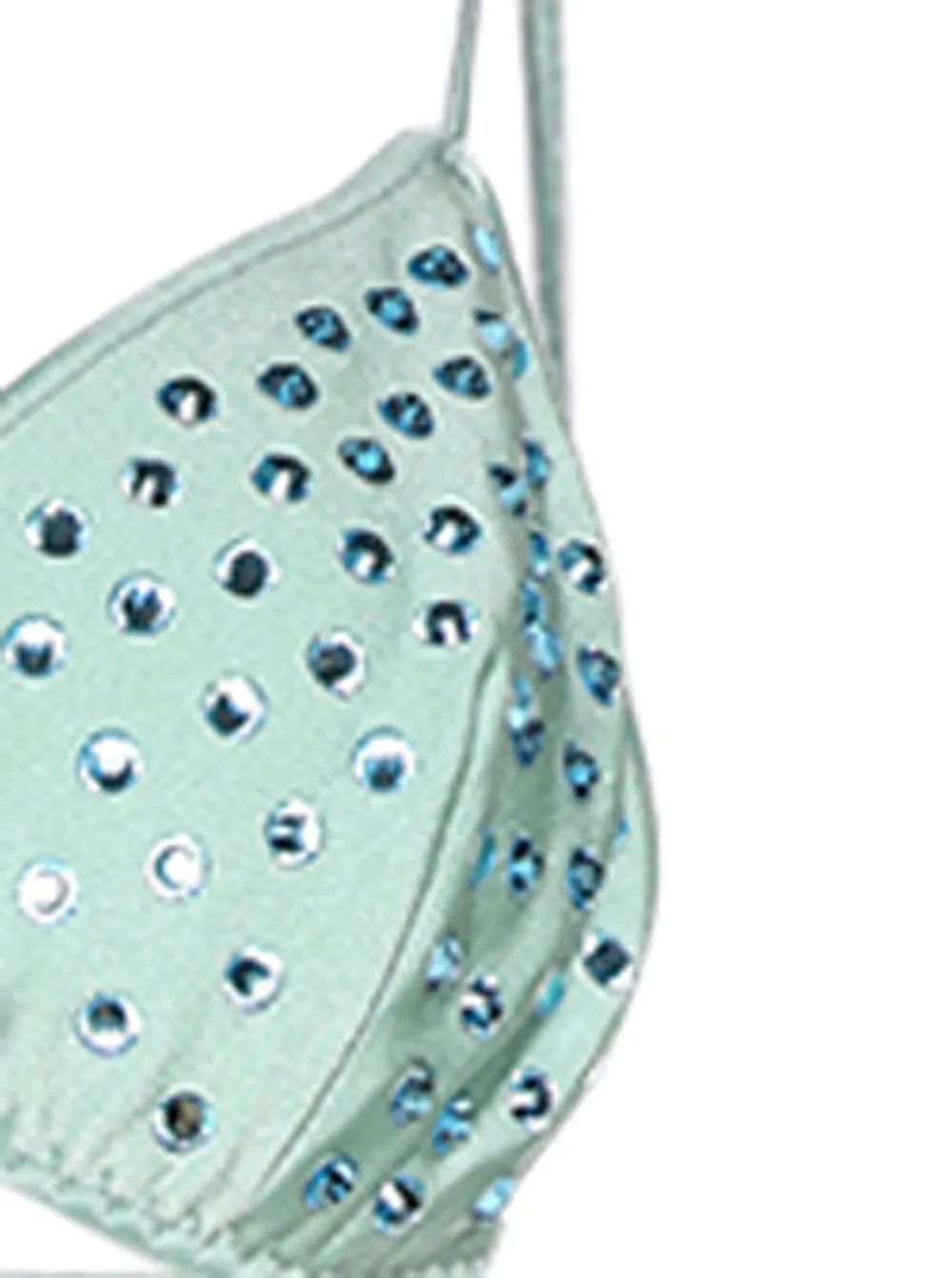 aqua groen scuba jersey stretch design verfraaid met kristallenTop triangel cup halternek striksluiting striksluiting aan de achterkantBroek hoog uitgesneden striksluiting aan de zijkant Zwemkleding moet over je eigen kleding worden aangepast.