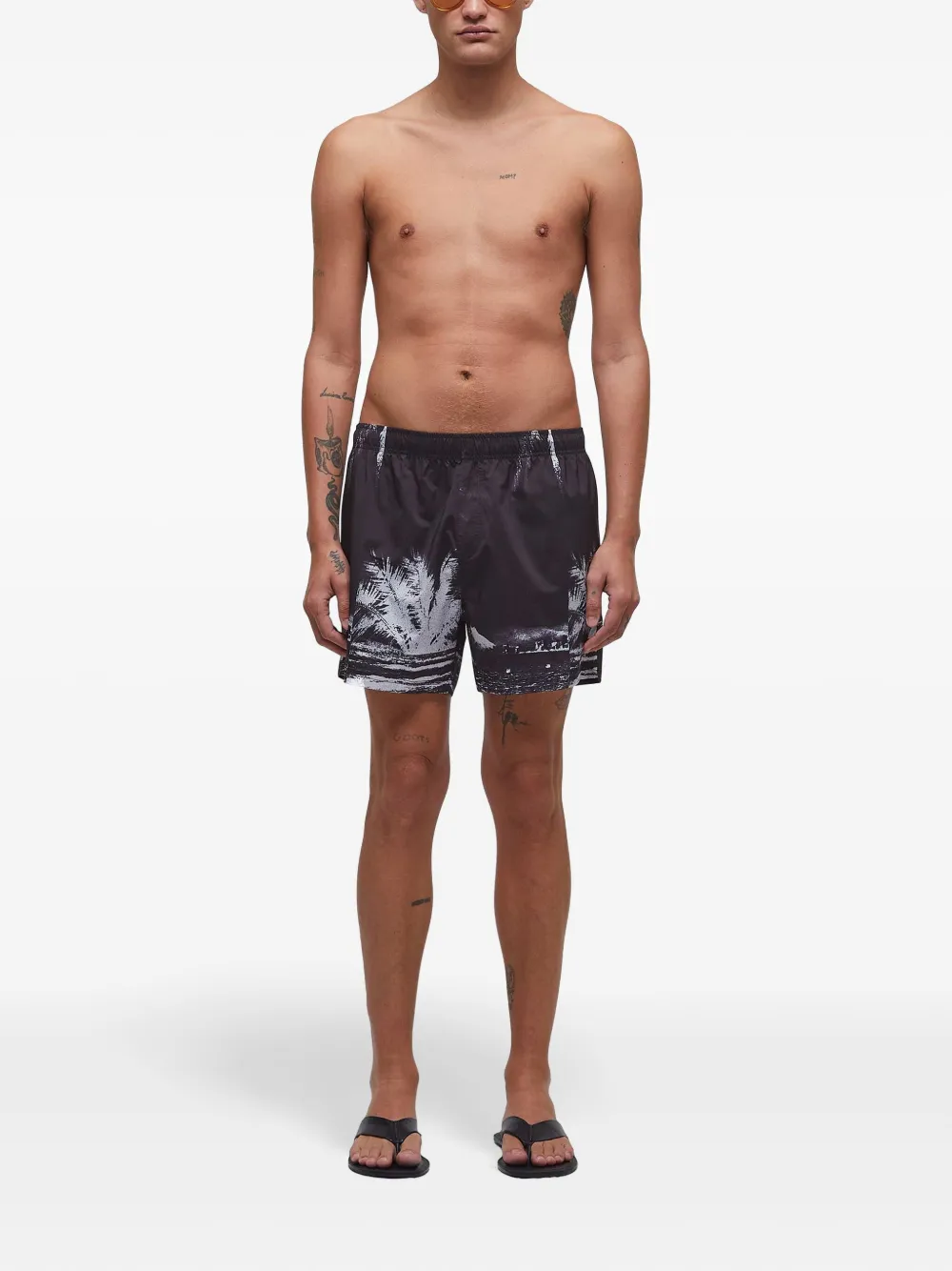 zwart palmboomprint elastische tailleband logoprint aan de zijkant opgestikte zak aan de achterkant Zwemkleding moet over je eigen kleding worden aangepast.