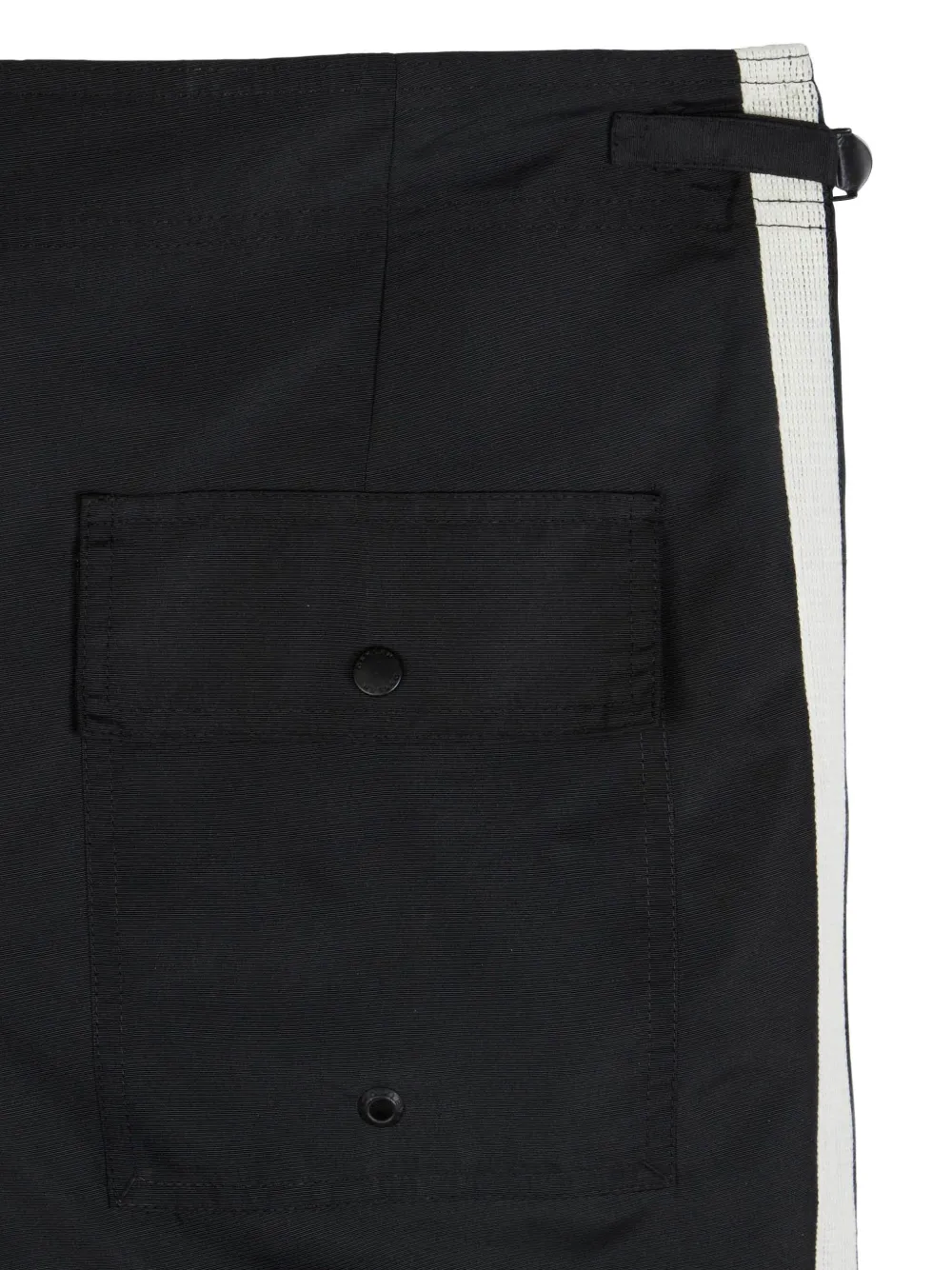 zwart/wit scuba jersey drukknoopsluiting en rits aan de voorkant mid waist zijstreep verstelbare bandjes twee steekzakken aan de zijkant logoprint op de pijpen klepzak aan de achterzijde dijlengte Zwemkleding moet over je eigen kleding worden aangepast.