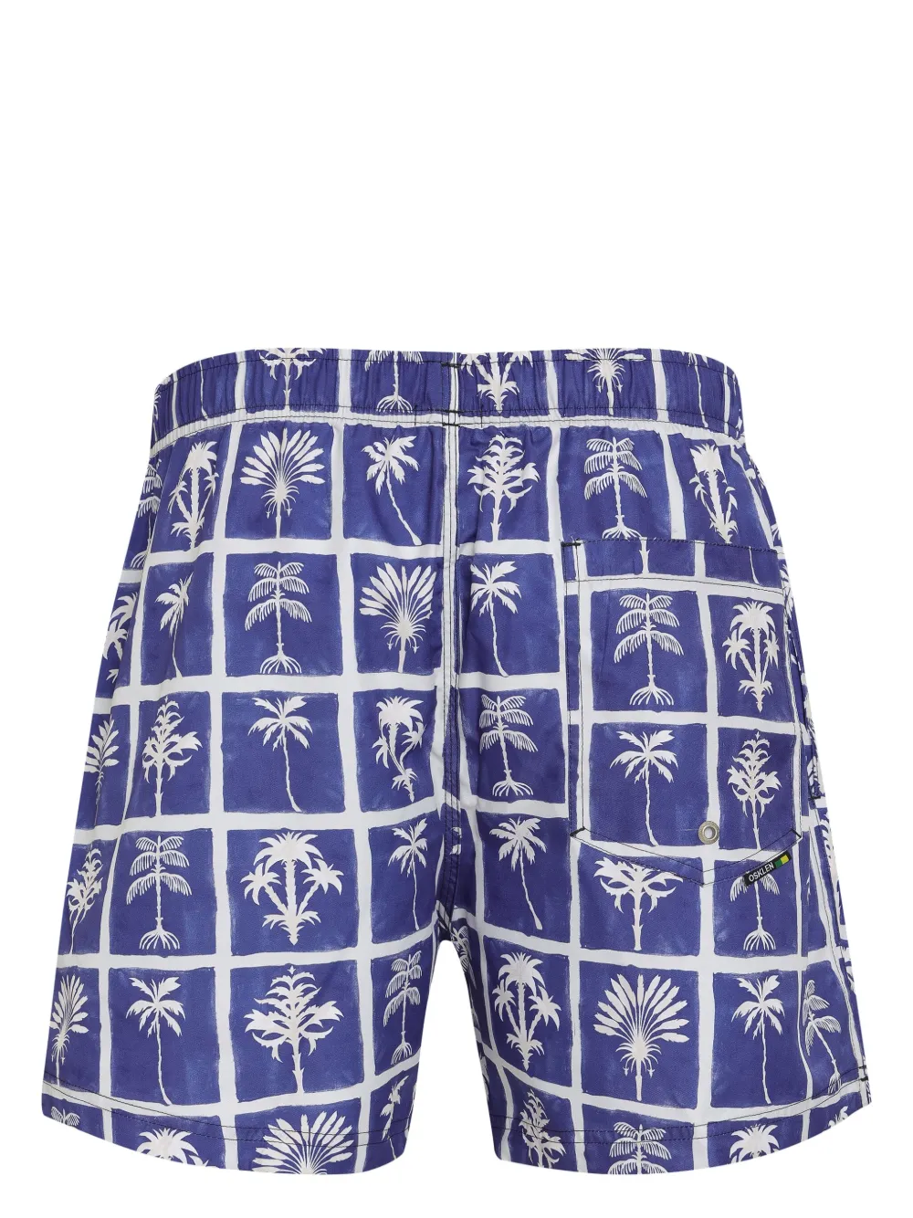 blauw/wit palmboomprint elastische tailleband opgestikte zak aan de achterkant lengte tot boven de knie Zwemkleding moet over je eigen kleding worden aangepast.