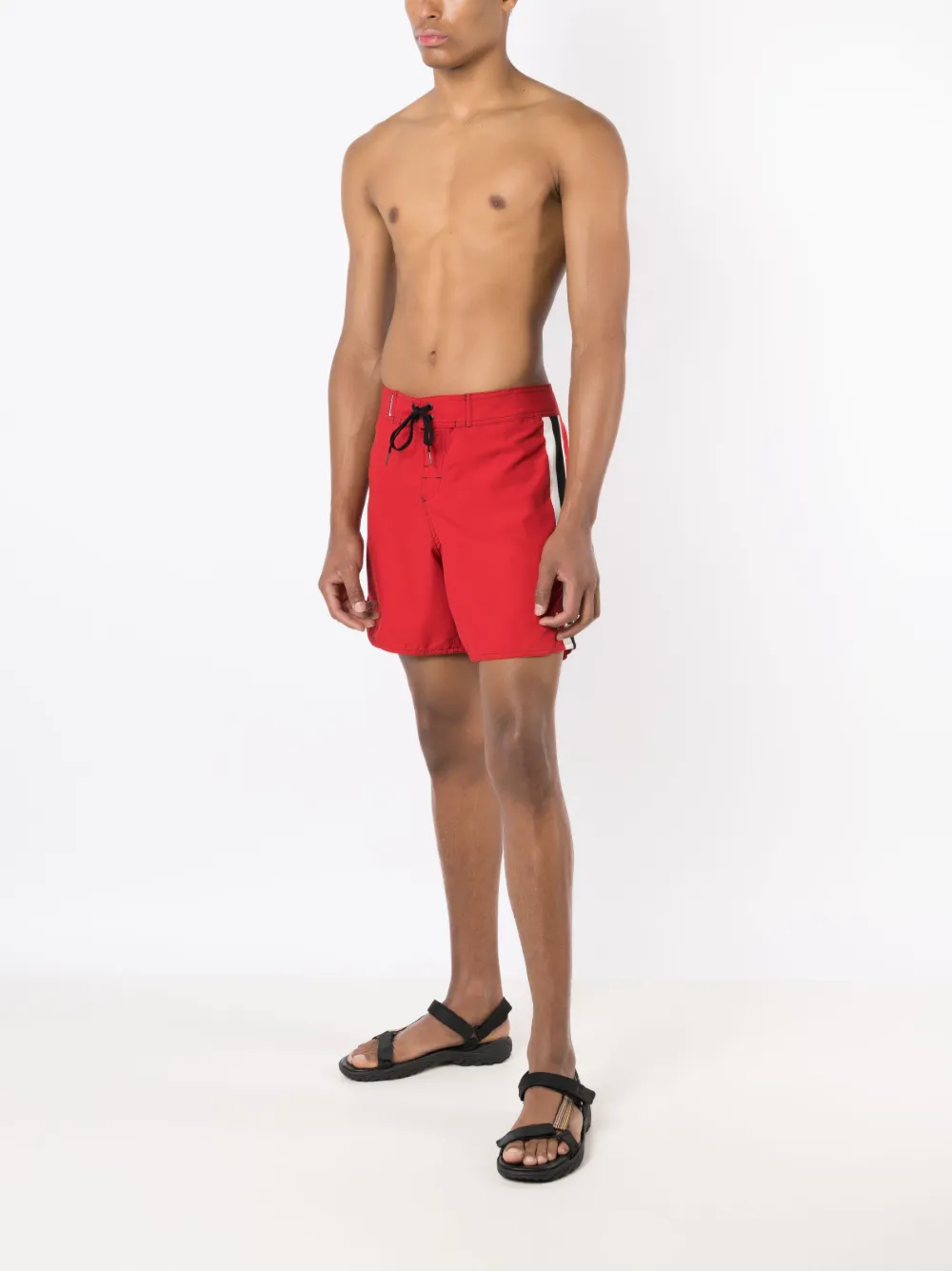 Helderrood, logopatches aan de voorkant, logopatch aan de achterkant, zijstreep, ringlets detail, contrasterende stiksels, lengte tot boven de knie, opgestikt vak aan de achterkant en trekkoordsluiting bij de taille. Zwemkleding moet over je eigen kleding worden aangepast..